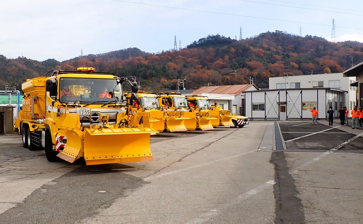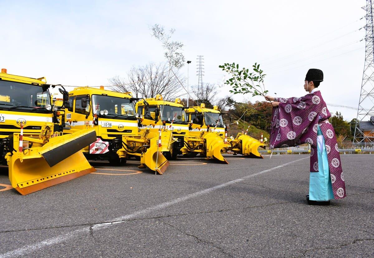 降雪の時期に合わせて、NEXCO中日本彦根保全・サービスセンター(彦根市原町)は12月11日、彦根市原町の彦根インターチェンジ内で雪氷対策作業安全祈願祭と雪氷出動式を開いた。