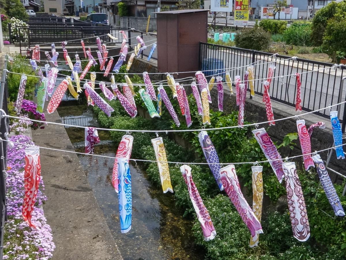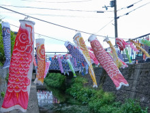 彦根市小泉町を流れる戸賀川(とががわ)に現在、色鮮やかな「こいのぼり」が飾られ、訪れる人を楽しませている。