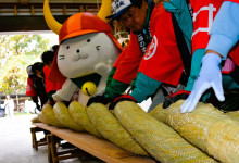 新年に合わせて彦根城内に飾るしめ縄の仕上げ作業が12月8日、彦根城作業所(彦根市金亀町)で行われた。ひこにゃんも作業員の中に加わり、駆けつけたファンたちの声援を受けながら一生懸命に手伝った。