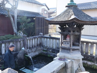 西今町の交差点の一角で湧き出る同湧き水は犬上川の伏流水。古くから名水として知られ、なかなか母乳の出なかった女性がこの水を飲んだところ、出が良くなったという言い伝えや、織田信長が安土への往来中に立ち寄って飲んだという逸話もある。中央には地蔵尊が安置され、1985(昭和60)年には環境省(当時は環境庁)の日本名水百選に選出された。日中は今も多くの人々が水をくみに訪れる。