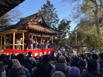 その後、奉仕者たちが登場し、片岡秀和宮司が矢を放つのを合図にスタート。巫女(みこ)の「鬼は外、福は内」と威勢のいい声が響く中、福豆と福餅がまかれ、参拝者たちはわれ先にと手を伸ばして「福」を手にしながら、それぞれの思いを胸に新しい春の訪れを感じていた。