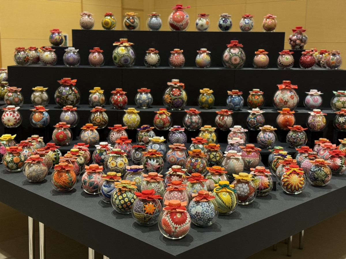 愛荘町の伝統工芸品である「びん細工手まり」を展示する「開館25周年記念 びんてまり展」が10月5日、愛荘町立愛知川びんてまりの館(愛荘町市)で始まった。