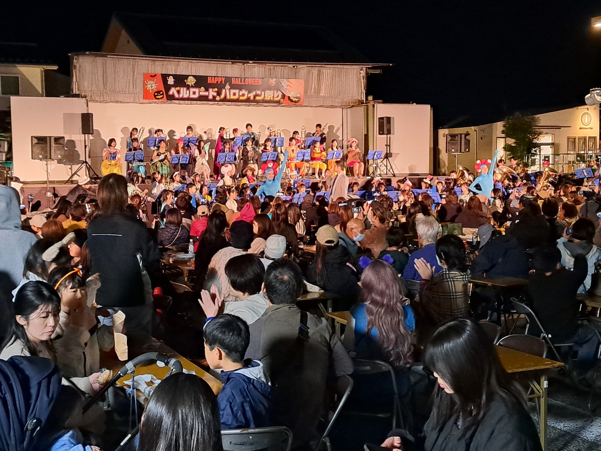仮装して演奏する近江高校吹奏楽部=ベルロードハロウィン祭り