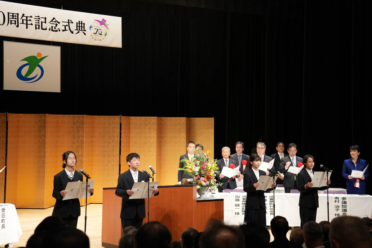 「愛荘町町制施行20周年記念式典」が11月23日、秦荘ハーティーセンター(愛荘町島川)で開かれた。
