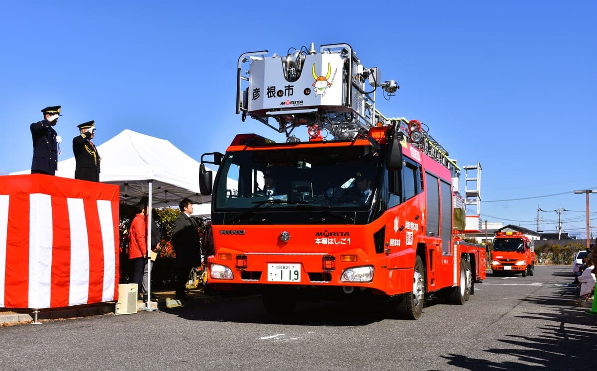 彦根市消防出初め式が1月10日、ひこね市文化プラザ(彦根市野瀬町)のグランドホールと屋外駐車場で開かれた。