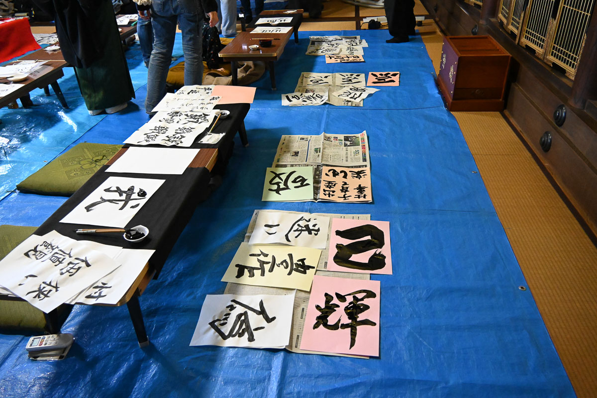 新年の抱負を書き、参加者同士で語り合う大人向け書き初めイベントが1月12日、勝光寺(愛荘町沓掛)で開催された。