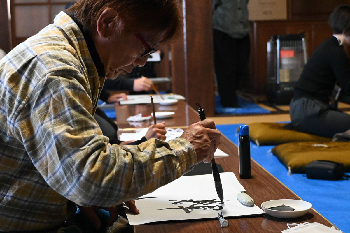 新年の抱負を書き、参加者同士で語り合う大人向け書き初めイベントが1月12日、勝光寺(愛荘町沓掛)で開催された。