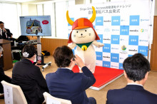 滋賀県は1月31日、彦根市内で自動運転バスの実証運行を始め、初日に彦根市役所で出発式とテープカットを行った。