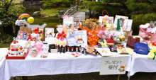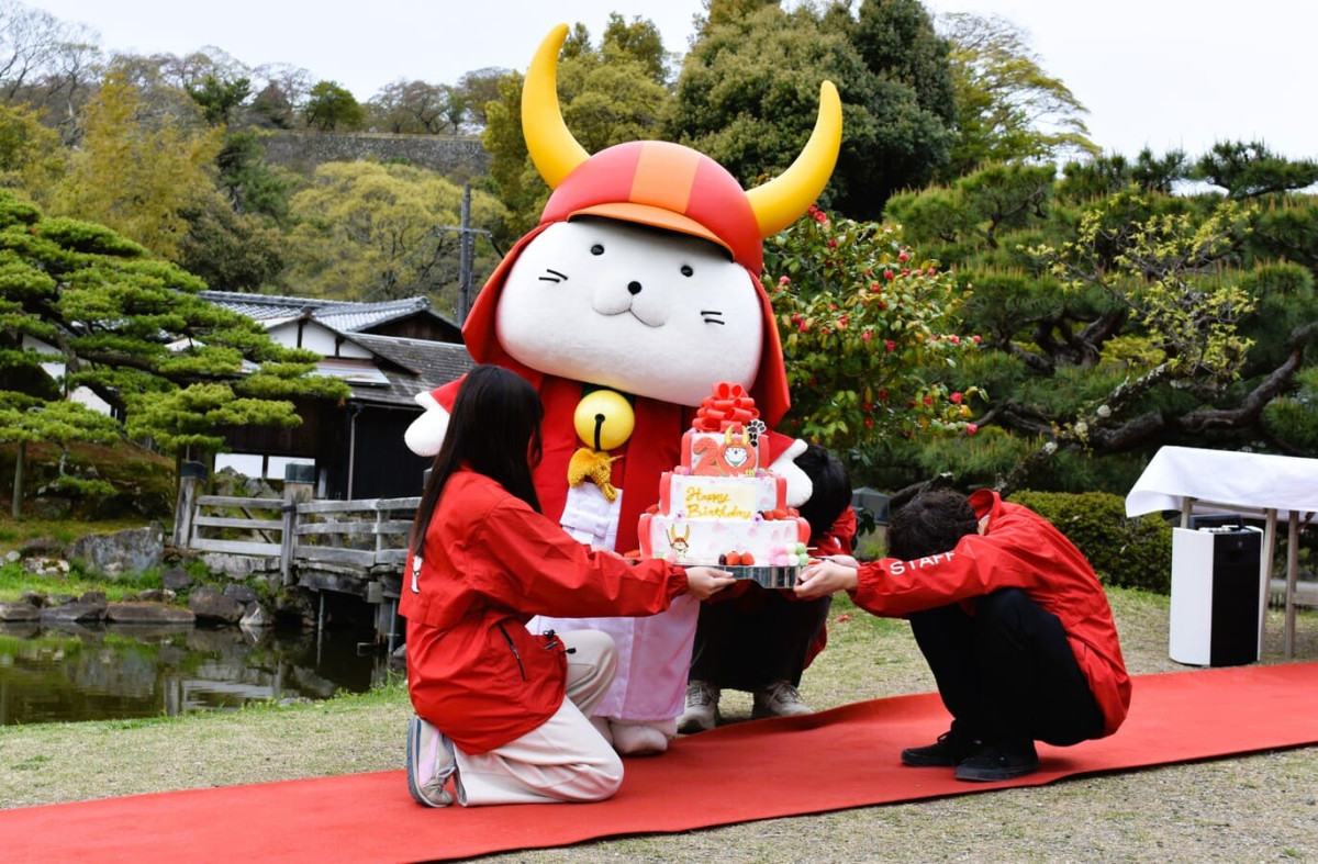 彦根市の人気キャラクター「ひこにゃん」が誕生から20周年を迎えた4月13日、彦根城一帯で記念の「お誕生日」イベントが開かれ、多くのファンでにぎわった。