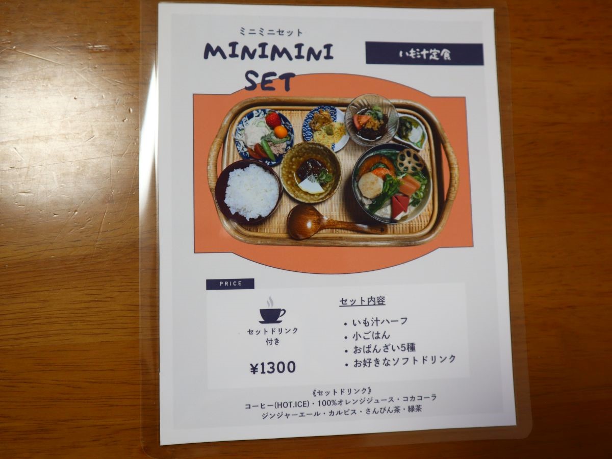 ハーフサイズのいも汁と小ごはん、5種のおばんざいとソフトドリンク付き『ミニミニセット』(1,300円)=こんき食堂