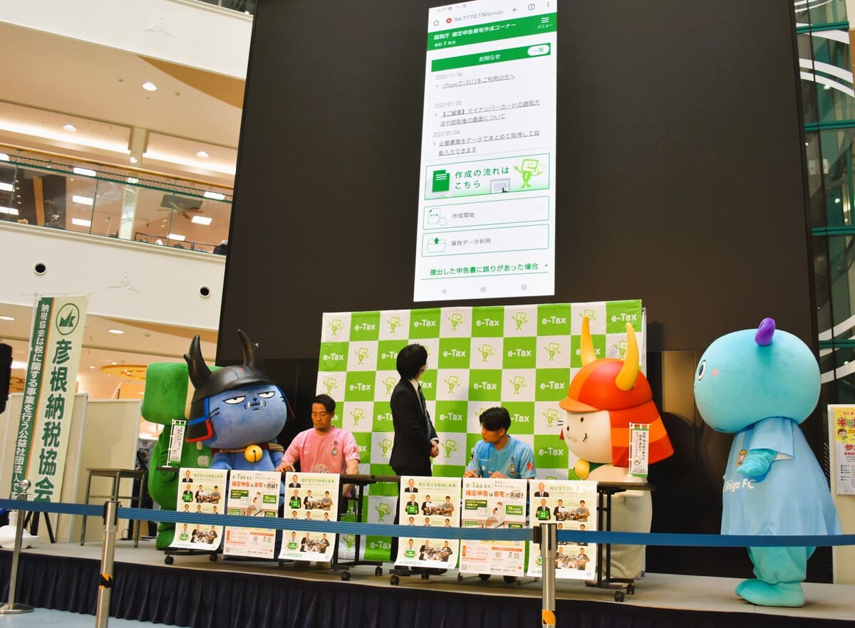 確定申告の時期を前にして、滋賀県初のJリーグチームになった「レイラック滋賀FC」の笠原淳選手と井出敬大選手が1月21日、ビバシティ彦根(彦根市竹ヶ鼻町)でe-Taxを使った確定申告の模擬体験に参加した。