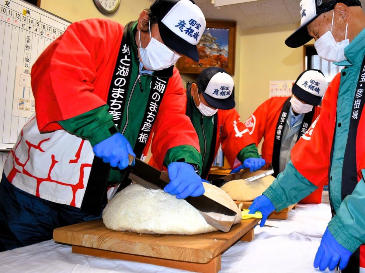 餅切り用の包丁を使って切っり分ける職員たち新春恒例の「鏡開き」が1月5日、彦根作業所(彦根市金亀町)で行われ、彦根城運営管理センターの職員たちが餅を切り分けた。
